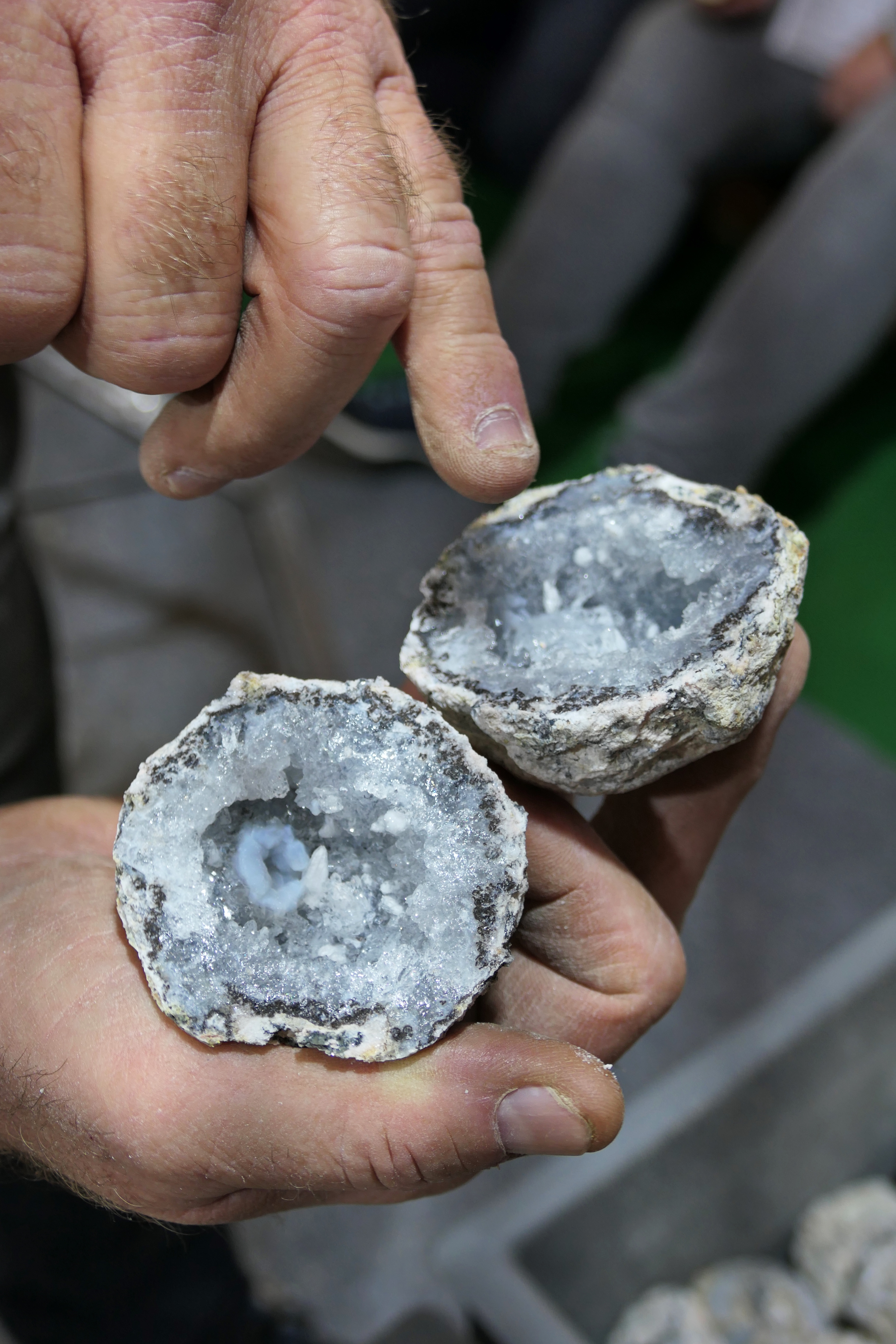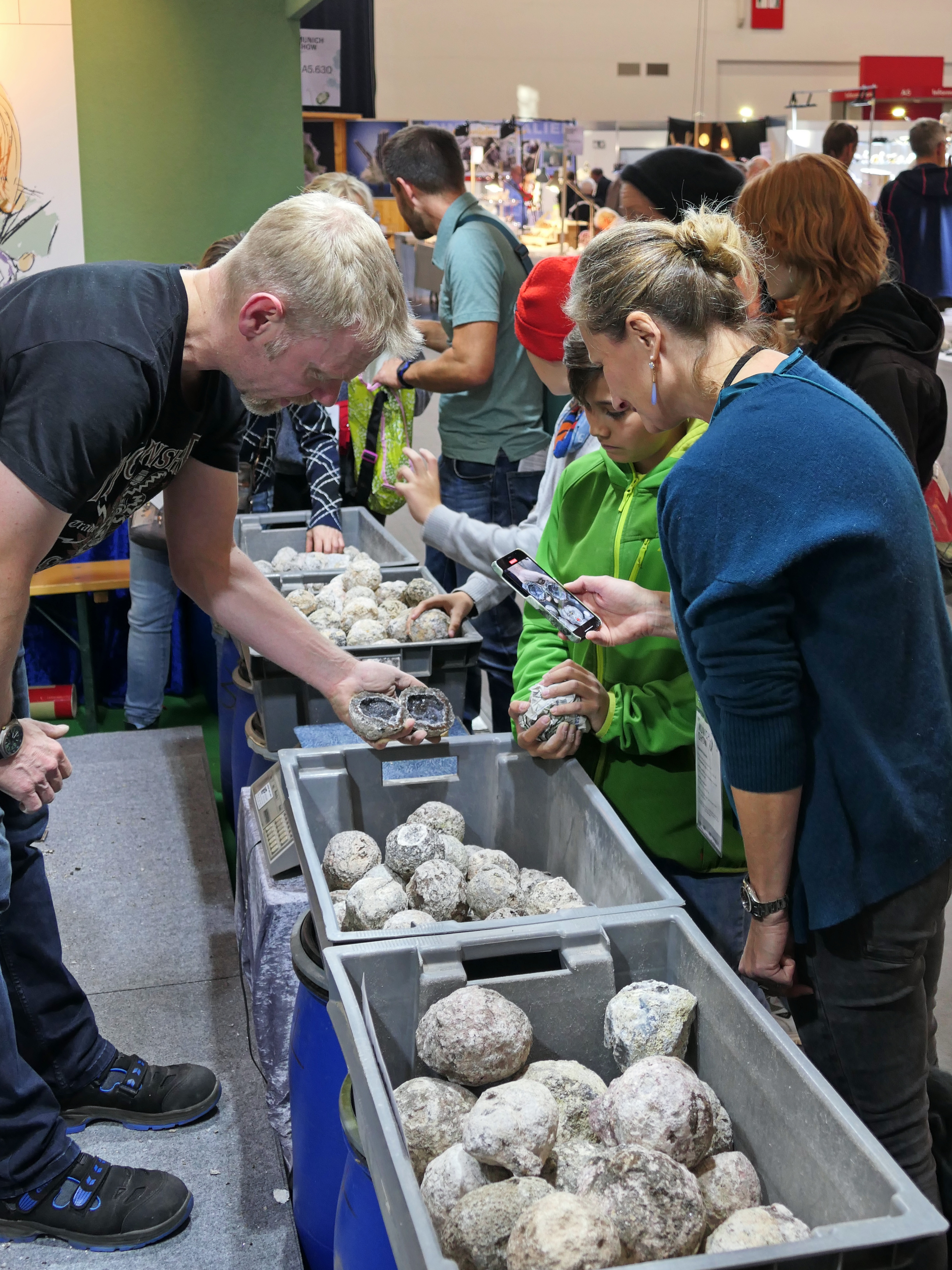 Experienced supervisors at the stand explain which minerals and crystals can be seen in the opened geode—an exciting moment that combines science and wonder in a special way.